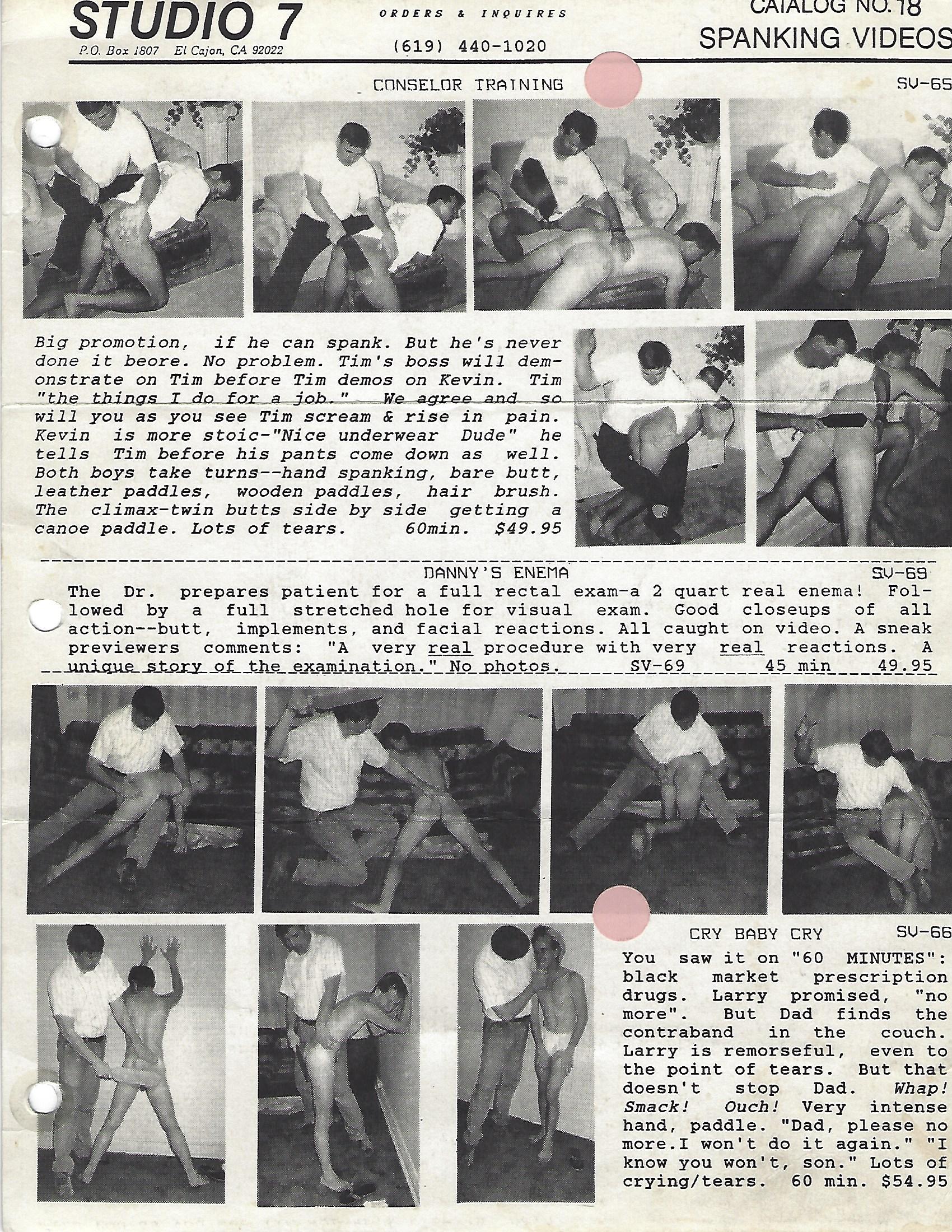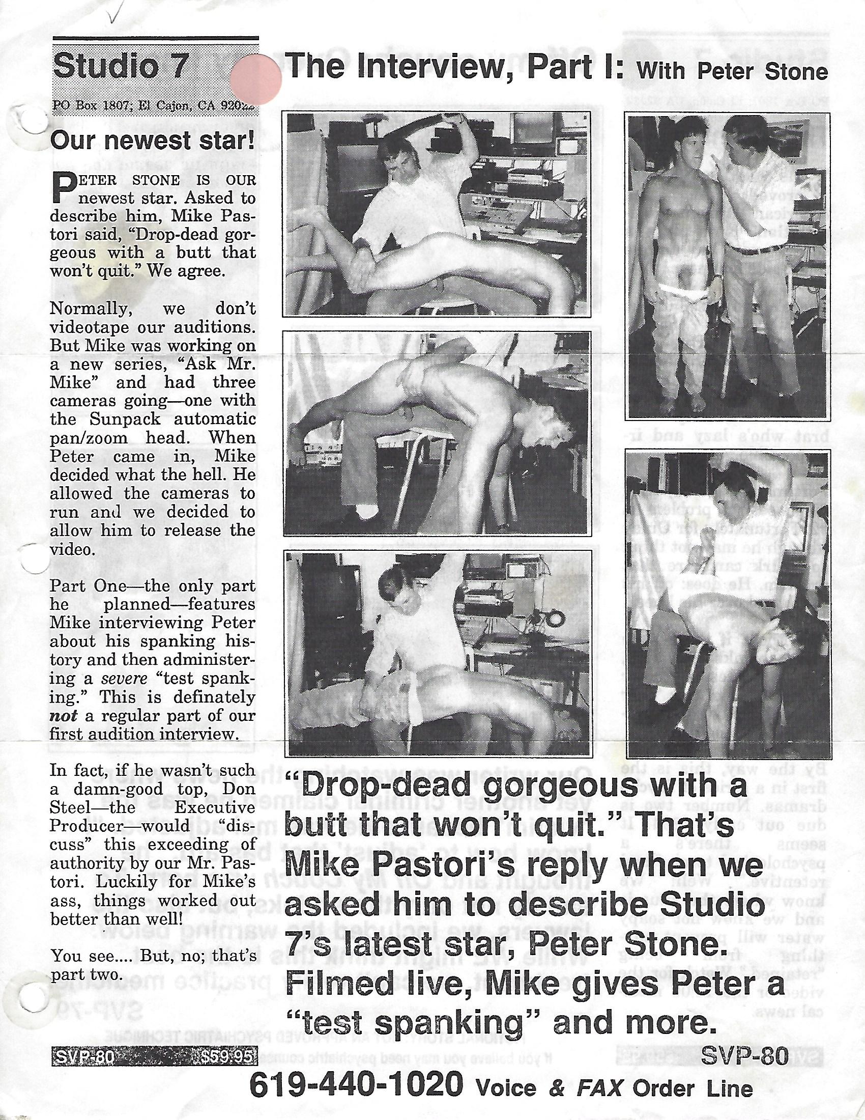 Over the next few years, Mike Pastori would go on to appear in 43 videos for Studio-7, including offerings like “Counselor Training” (SV-65) where he mentors a new employee in how to discipline by first spanking him, and then having him demonstrate what he just learned on a subordinate; “Cry Baby Cry” (SV-66) where a father repeatedly reduces his son to tears; and “The Interview with Peter Stone” (SV-80) featuring a strapping new lad who went on to appear in a half-dozen videos for the studio.