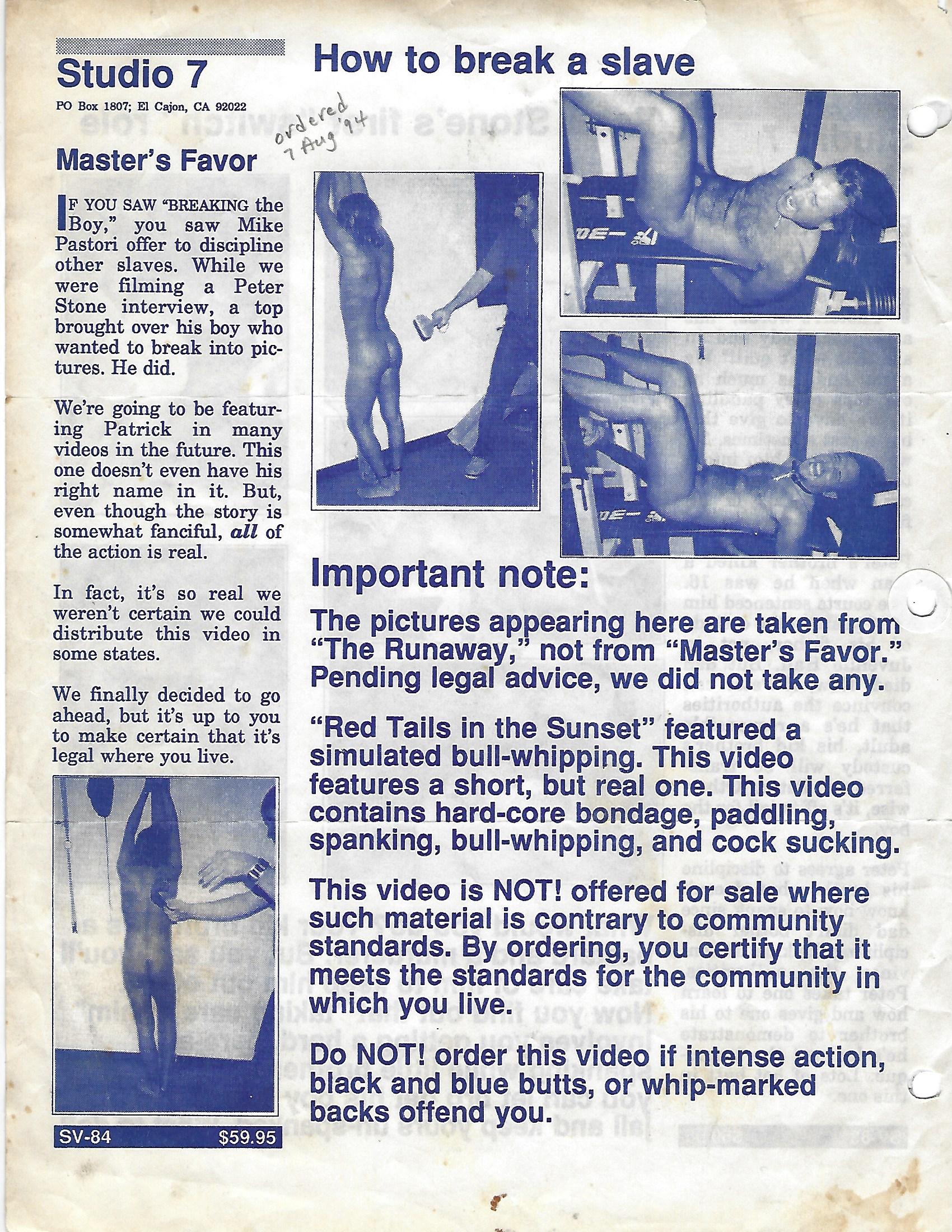 After Mike’s passing, Studio-7 offered a “Final Tribute” for his fans, by discounting his videos for a period of time. I am attaching a copy of that flyer, although you might notice that whoever typed it repeatedly misspelled his name “Pastoria”. Additionally I’m including several of the original catalog pages from his films, including his first video (please note that in the description, “Mike” is referring to a character’s name and not Pastori), as well as the first Peter Stone video, and one of his severe videos, “How to Break a Slave” that Studio-7 wasn’t even sure could be legally released.
