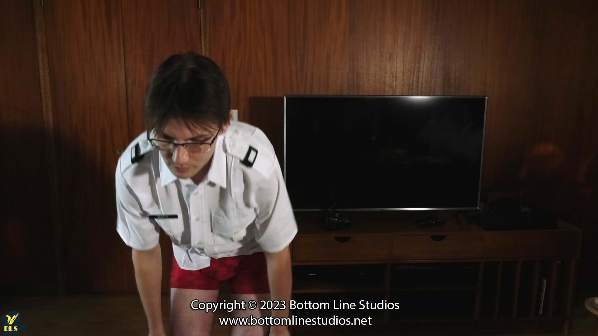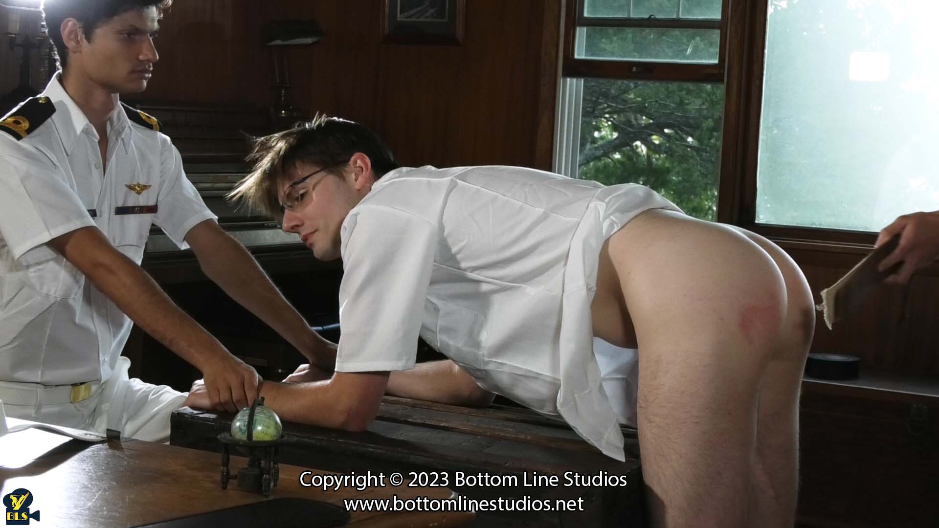 Luckily for the lewd lad’s lieutenancy-prepping, lots less lucky for his lots-lacerated lowly-lout-lower-limbs, lately lazy Riley’s week-long quarantine after a reckless African holiday required all his spoiled charges to be handled by harder-handed handler Diego, who harshly hided their helplessly-heightened humble-hound-hinies hell-hot, hearing how all others hate the n°-1 nerd who ‘never needed’ nasty naked nates-nurture in Riley’s book, despite the longest list of demerits by far in French’s red book, which when he mentioned it to the Commodore was subpoenaed, so Diego could avidly, ably and amply administer appropriate all-attire-abandoned-abject-adolescent-arses-agony at-last to all, except David, who disputed Diego’s ‘usurped authority’ instead of dropping trou: compelling cause for a captain’s mast (naval court-martial), Commodore presiding, condemning the cockily-contrary cur on countless counts of contraband and contrary conduct to copious CP, comprising the current clothless-cones-criss-cross-crimson-colouring-cuts and a complementary corrective condition: constantly compelled to cope with CP from Diego, who is here acting as ceremonial court bailiff, warmly-whooping warmer-up and holder-down for the higher-ranking sway-wielding officers administering ‘discipline at the mast’, but(t) these sample strap-floggings are basically a symbolic prelude to his promptly-following power to practise at his pleasure pantless-posterior-punishment as plentiful and pitiless as he prefers to pain-purple the pretentious, previously-protected prick, while for David Riley’s role is reduced to this last lashing, when Diego ‘puts the straps away’ he’ll actually take possession as David’ abject ass-arse will be his to bonnily bate and beat black and blue, brutally blistered as bountifully as befits nest-behaviour-bettering by bare-balls-bum-bottom-battering.