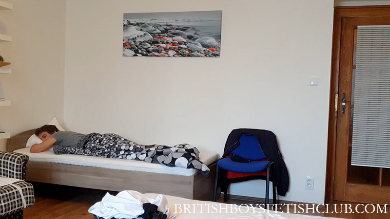 Grabbing the cover Dimitri whips it off and wakes up the sleepy lad.