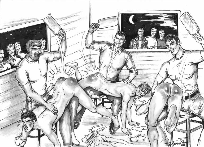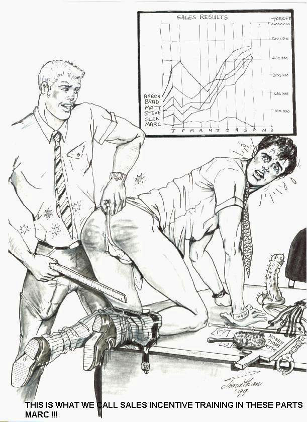 A small collection of drawings by the artist Jonathan featuring hunky young men being punished in prison (or in the case of the top one, in police custody)