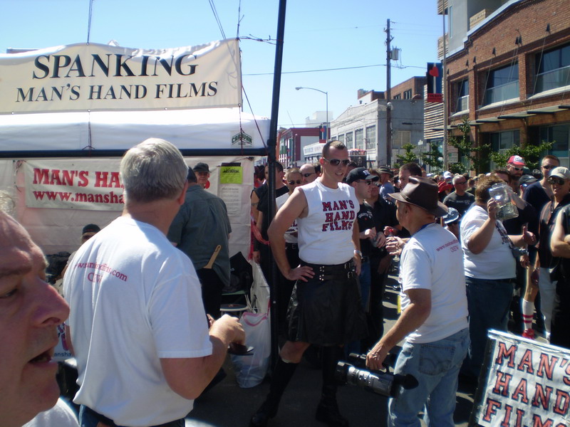 A young stud in a leather kilt receives the attention of the excellent gay artist Copper outside the Mans Hand Films booth at Folsom Street.