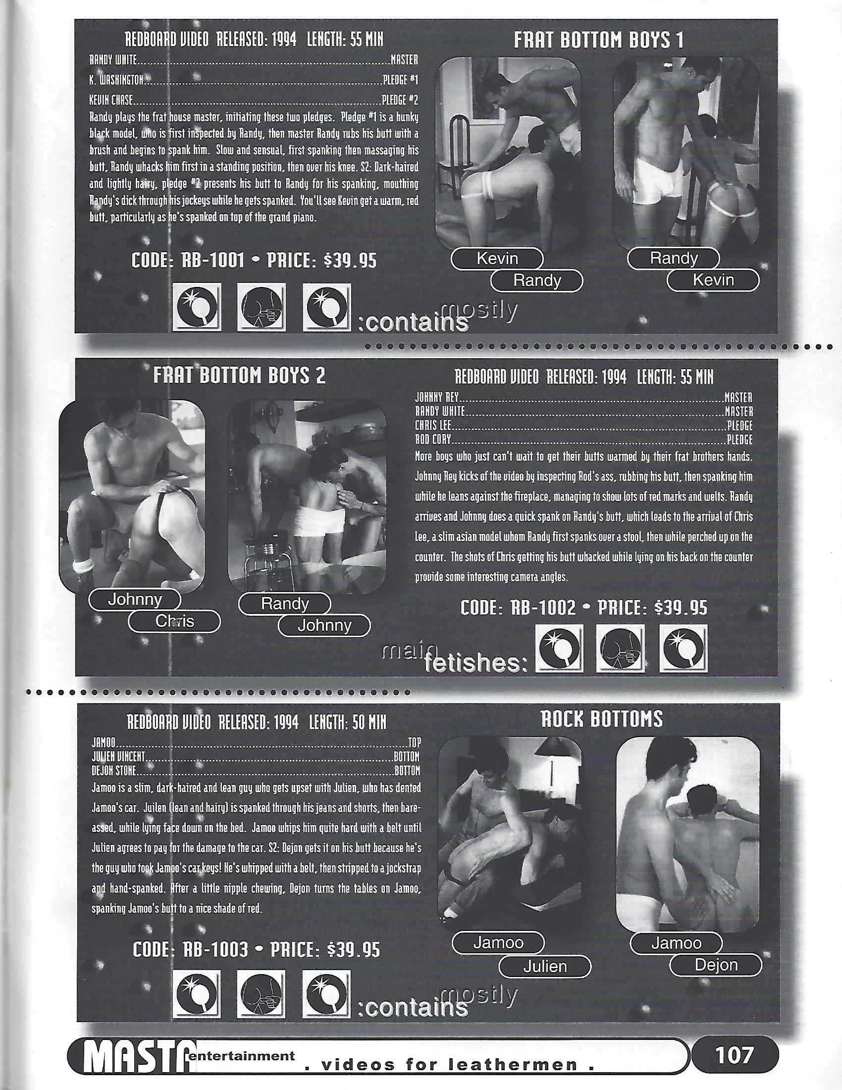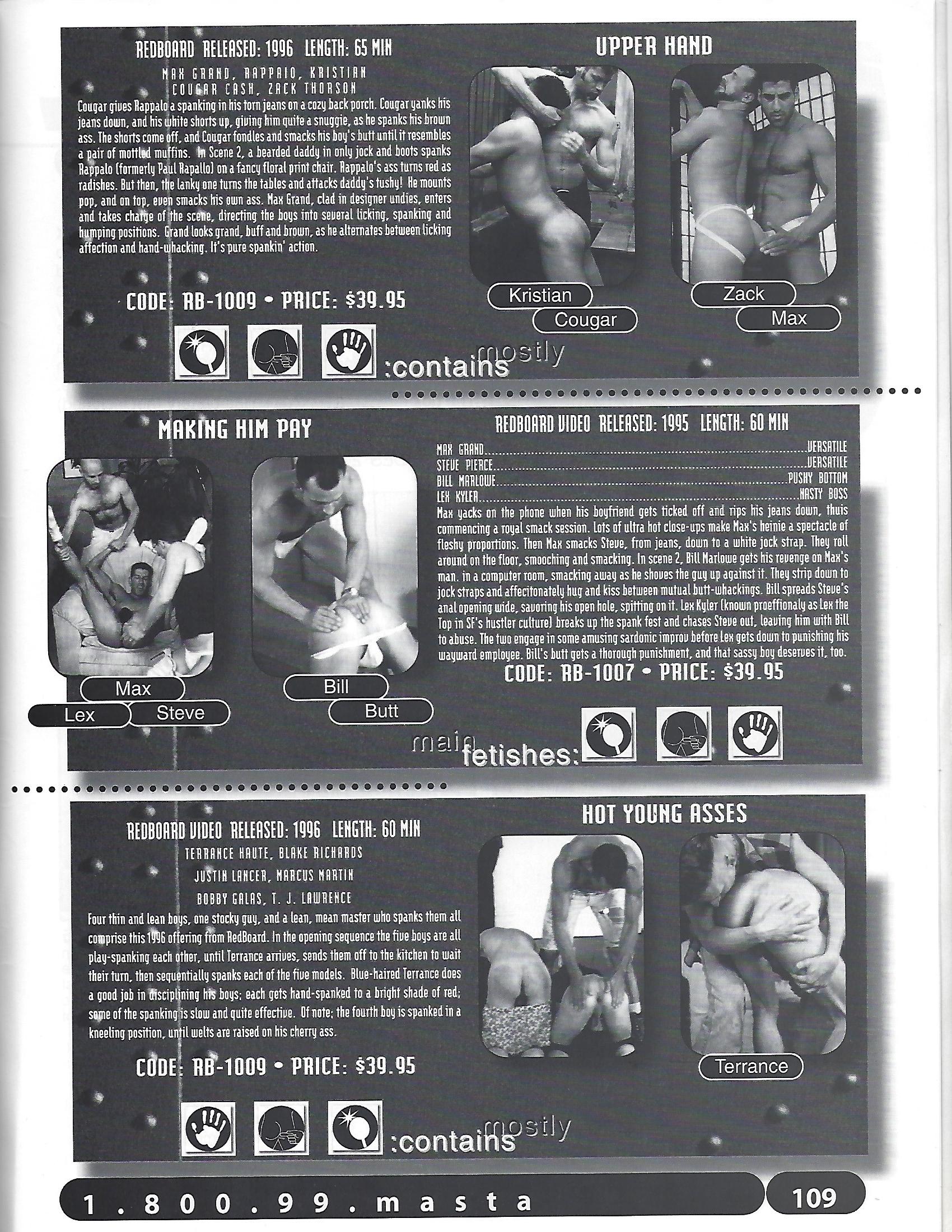 In all, RedBoard produced 21 gay spanking titles. In alphabetical order their male videos were: “Bad Boys Get Hurt”, “Come to Blows”, “Frat Bottom Boys 1 and 2”, “Fresh Boy Thrashings”, “The Hard Way”, “Hot Young Asses 1 and 2”, “Houseboy Training”, “Kinky New Meat 1 and 2”, “Making Him Pay”, “Pounding Peters”, “Rawhide Red”, “Rock Bottoms”, “San Francisco Bondage Club 1, 2, 3 and 4,” “The Tender Spot” and “The Upper Hand.”