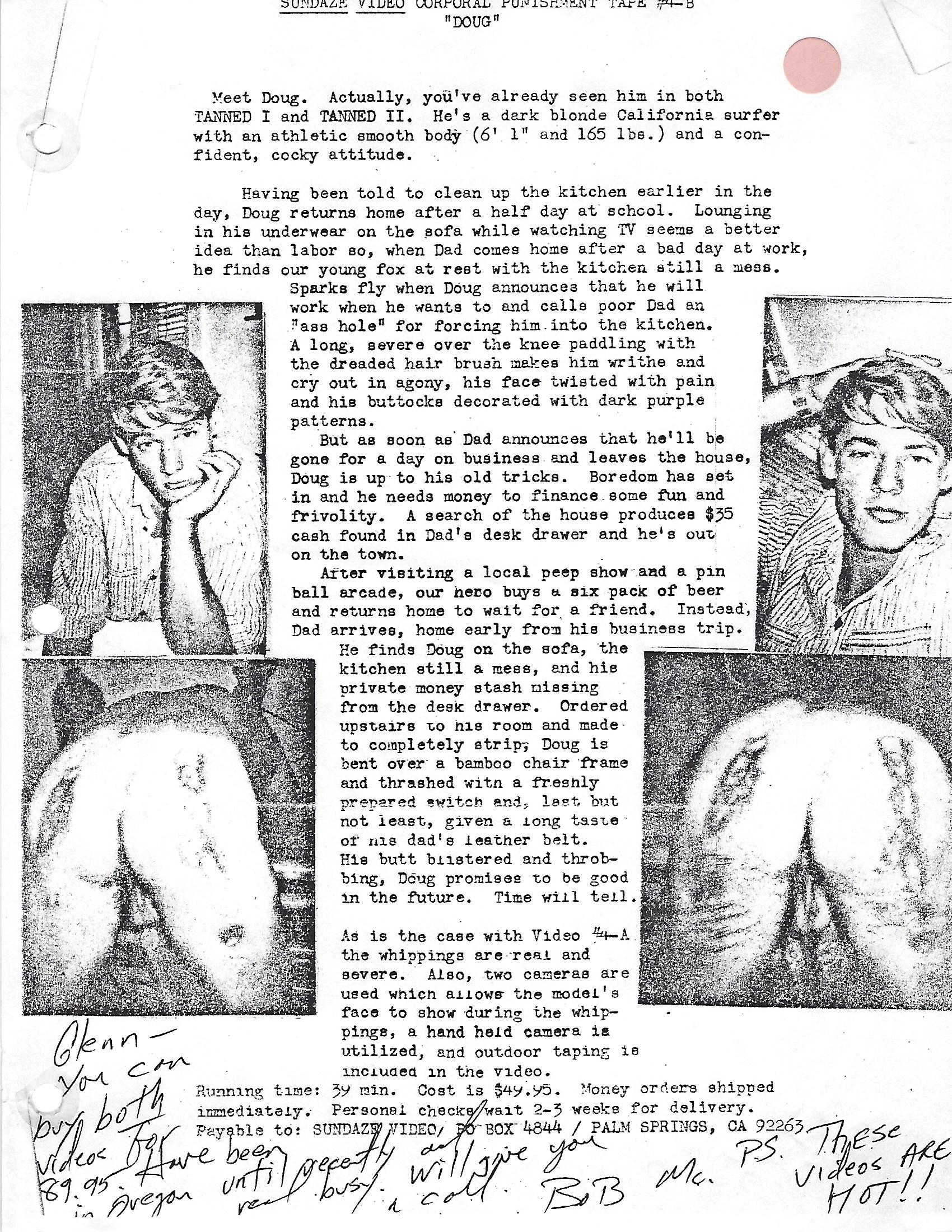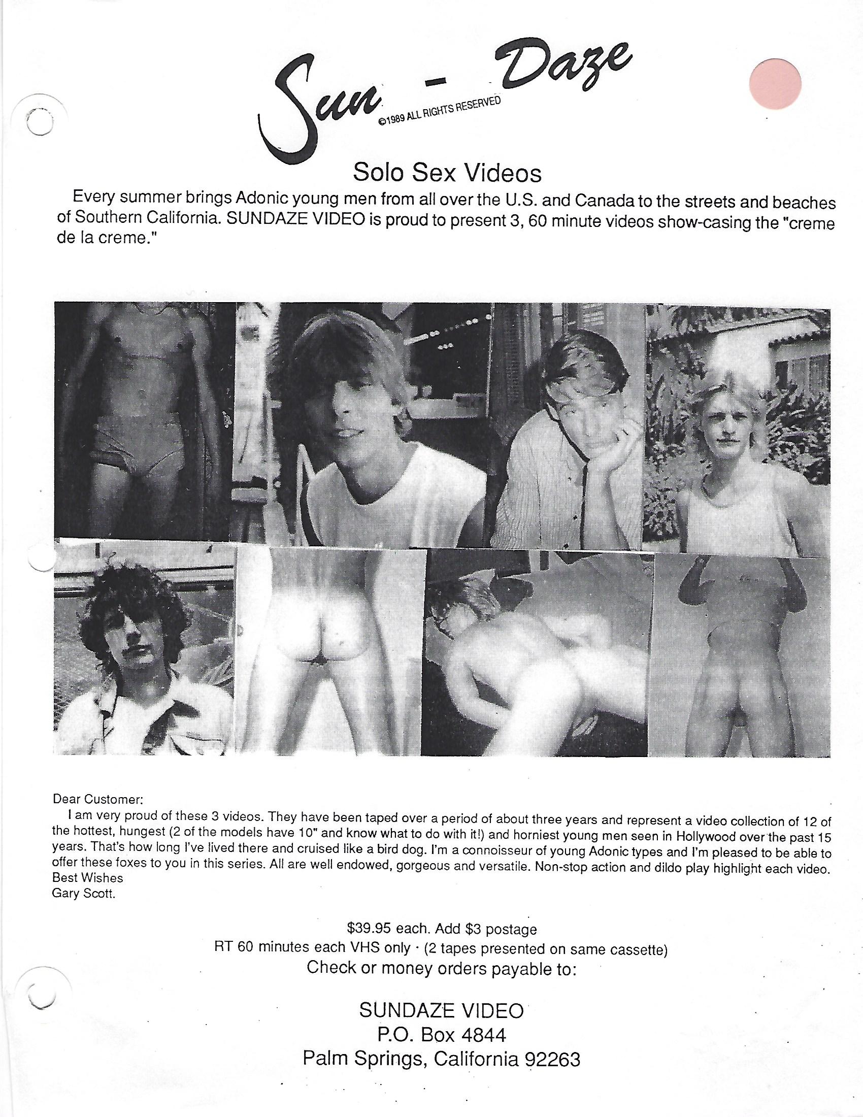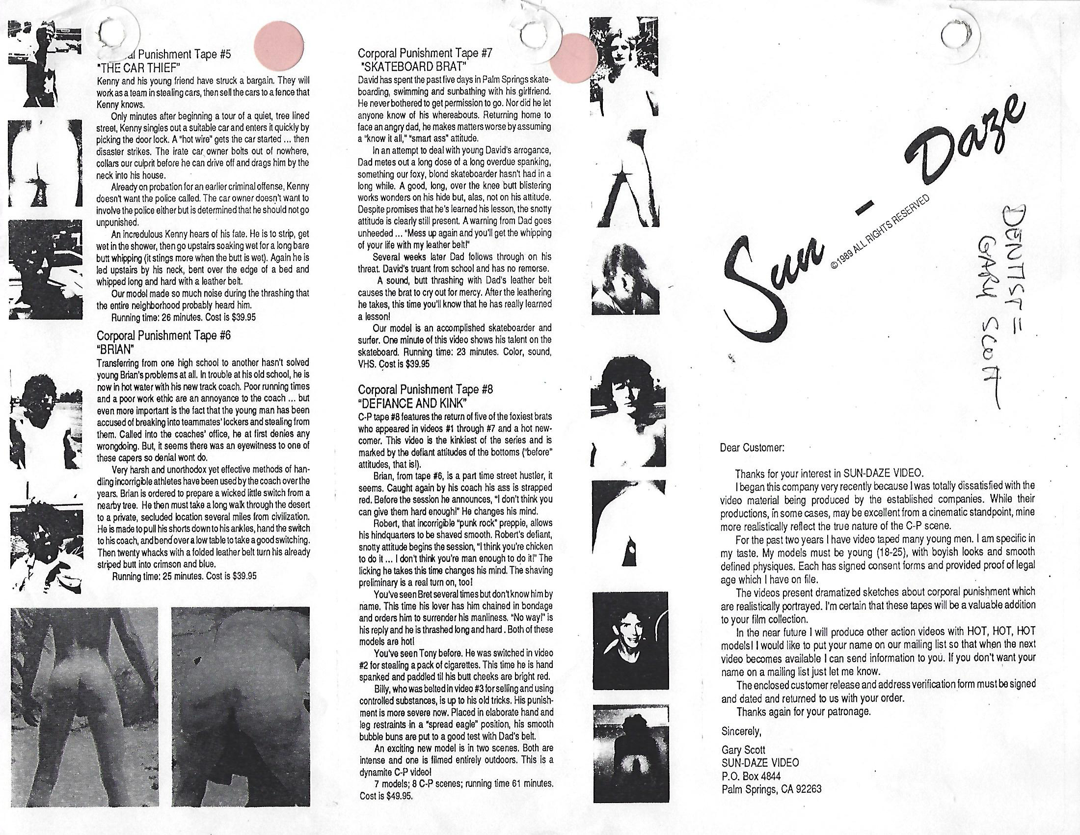 In the late 1980’s, SUNDAZE PRODUCTIONS made a short-lived appearance on the male spanking scene. Based in Palm Springs, California, a local dentist, Gary Scott (not his real name), began filming his regular spanking sessions for his own pleasure. These videos were shot using models, most of whom were male-prostitutes that he picked up in locally or in Hollywood. After seeing the success of production companies like Studio-7 and Man’s Hand Films, Scott decided to offer his videos for sale on VHS cassettes. The “Sundaze” logo seen at the beginning of each video was actually the sign on the wall of an apartment building that he owned, and most of the sessions were shot there. Scott sold the videos for $39.95, about half the price of his competitors. Gary would often communicate with his mail-order customers, offering to customize cassettes for them, combining specific videos or models.