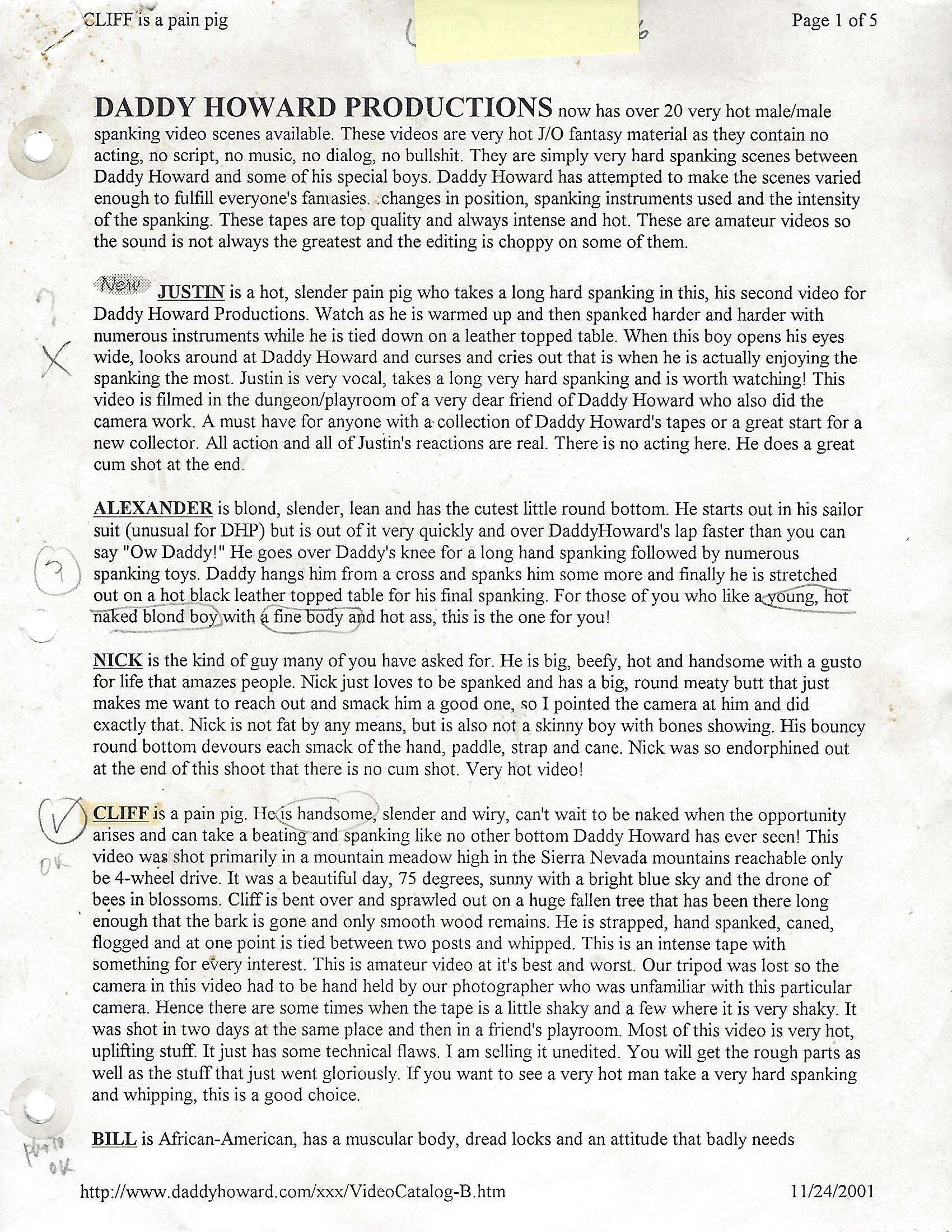 Attached are a few remnants of Howard’s videos including his favorite face shot (above), a couple images of him spanking, a page from his first, typewritten “catalog” and then two pages of never-before-published photographs that were taken behind the scenes during the taping of his segment from “The Misadventures of Rusty.”