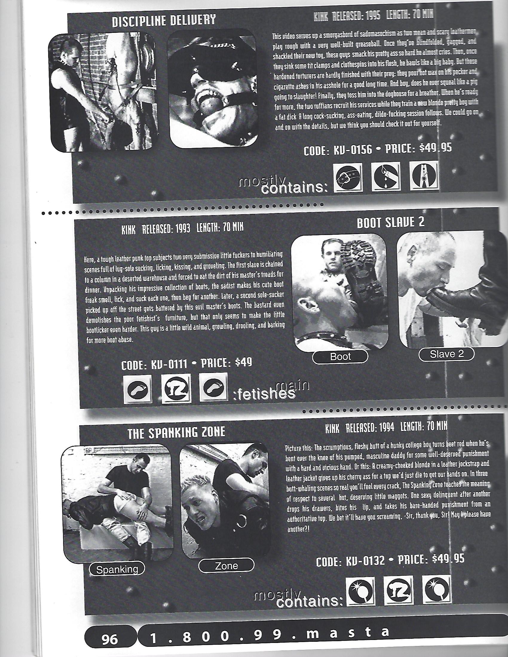 Based in San Francisco, KINK VIDEOS has been around since the early 1990’s, and true to their name, they specialized in a variety of fetish films including BDSM, tickle-torture, foot worship, shaving and – of course – spanking. Over the years Kink Videos produced just under twenty spanking videos. These include: “Bad Boys Get Spanked”, “Butt Punisher”, “Command of the Hand”, “Discipline Delivery”, “Good Dog”, “Jason Miller Ready for Hard Punishment”, “Make It Hurt”, “Over My Knee”, “Punished Good”, “Punished (Part 1 and 2)”, “Punishment”, “Spank Me, Sir”, “Spank My Ass”, “The Spanking Zone”, “Torture Clinic” and “Tortured Senseless.”