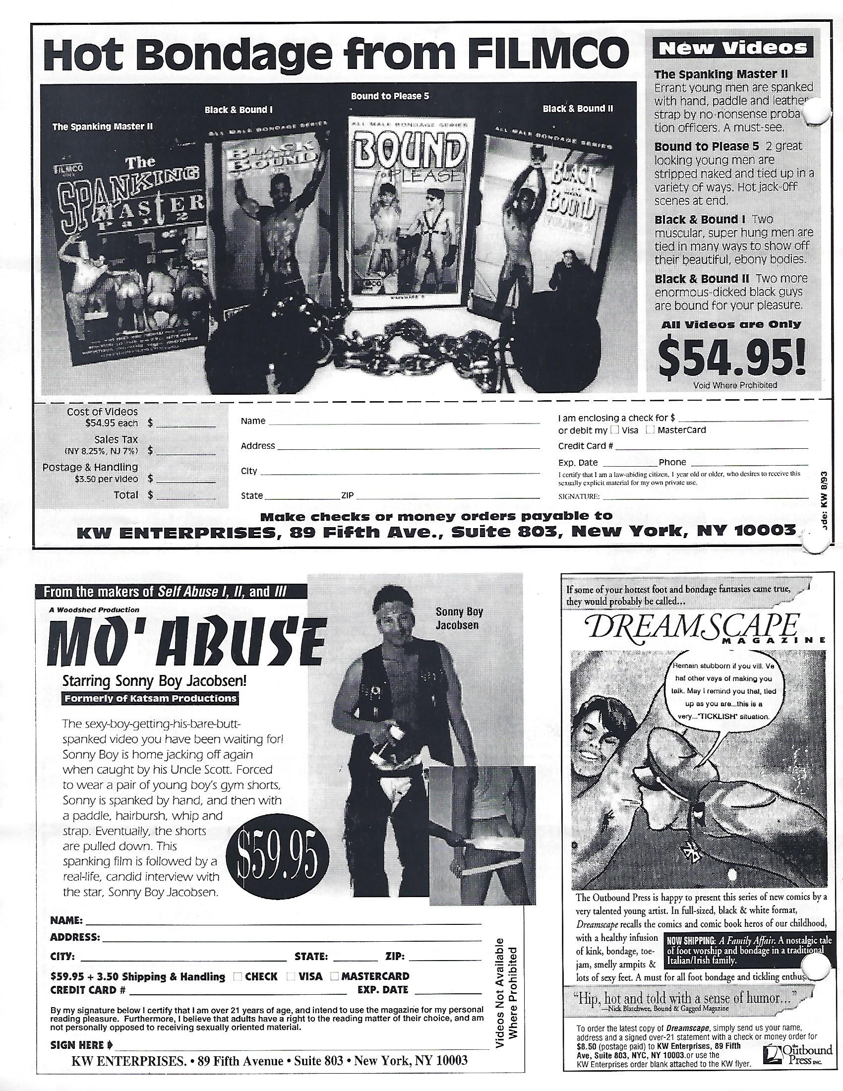Originally called KATSAM PRODUCTIONS, this provider of fetish films created a library of over 40 videos with a variety of fetishes that included bondage, watersports, body shaving and occasional spankings like “Beat Me, Daddy” and “The Spanking”. Although they were based in New York City, they had a series of punishment videos that were shot in Southern California and starred “Sonny Boy Jacobson”. These began with “Self-Abuse” (1988) that had Sonny slapping his own butt with a variety of tools. Based on its success, they then released “Self-Abuse 2 & 3”, which led to another series of five videos called “Mo Abuse” in which older men would take turns spanking, paddling and strapping Sonny in a number of positions. As part of the fifth video, shot in 1994, Sonny was introduced to one of the earliest versions of a spanking machine – a pneumatically driven cane that would strike his ass as he was lying on a massage table. The videos originally sold for $59.95 on VHS, but haven’t been available for many years. I will include a half-page ad for their videos from a leather magazine.