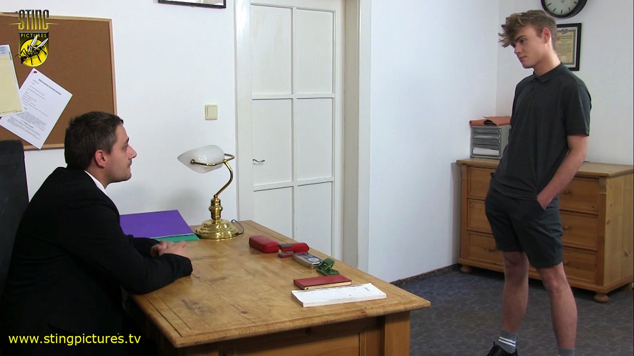 Inmates of institutions that are designed to re discipline their young inmates also have periodic exams to track a lads progress. The boys in re training need to get good results. Of course there are ways of ensuring that by cheating but those attempting it soon find out that the offence of cheating carries some very severe consequences!One such boy, Charlie (new StingLad Lukas Lacey) is caught out by his Housemaster and sent off to his study to be disciplined.