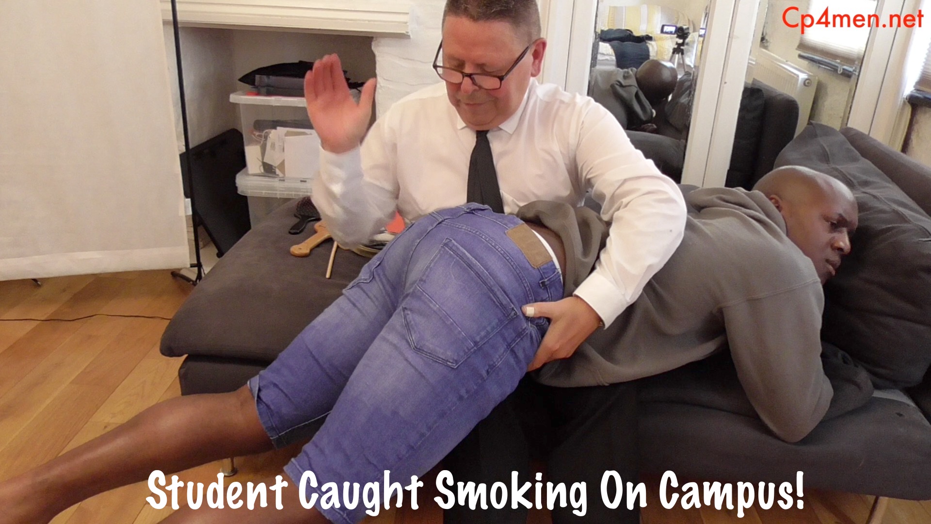 Time and time again Ebor has been told not to smoke on campus but this time the principal has had enough and feels a short sharp shock is in order. He gets him by the ear and before he knows it Ebor is across his lap getting what he deserves-a good spanking on his upturned buttocks-and what an excellent pair of buttocks they are!