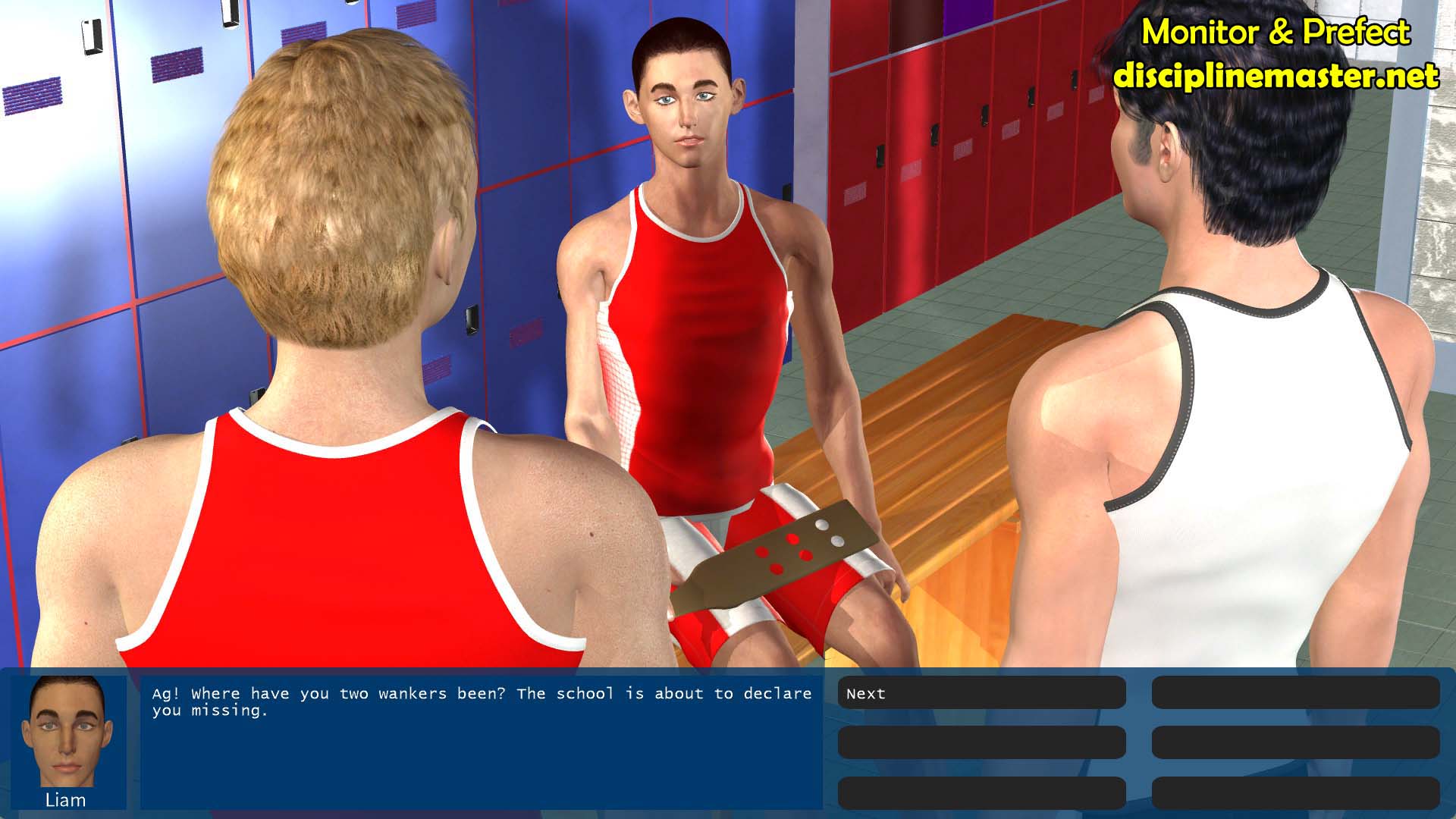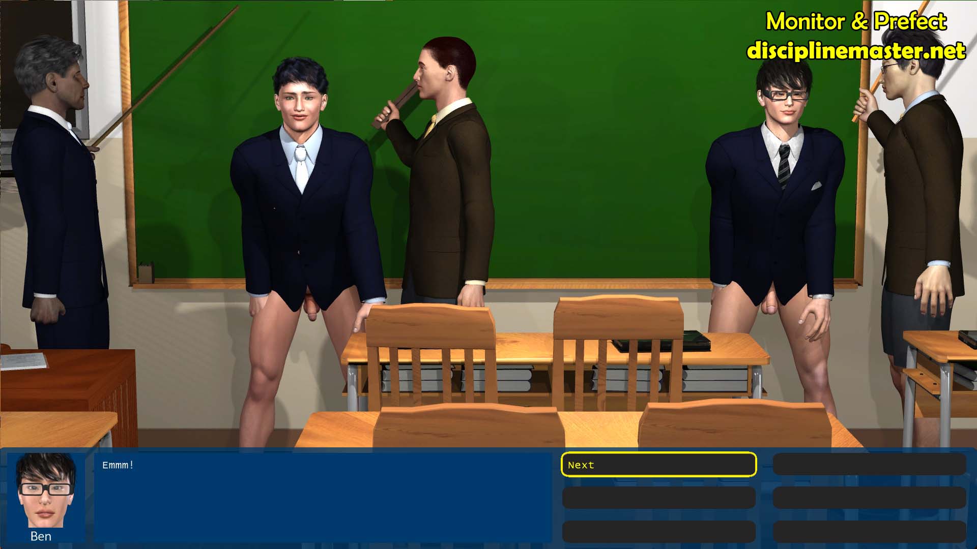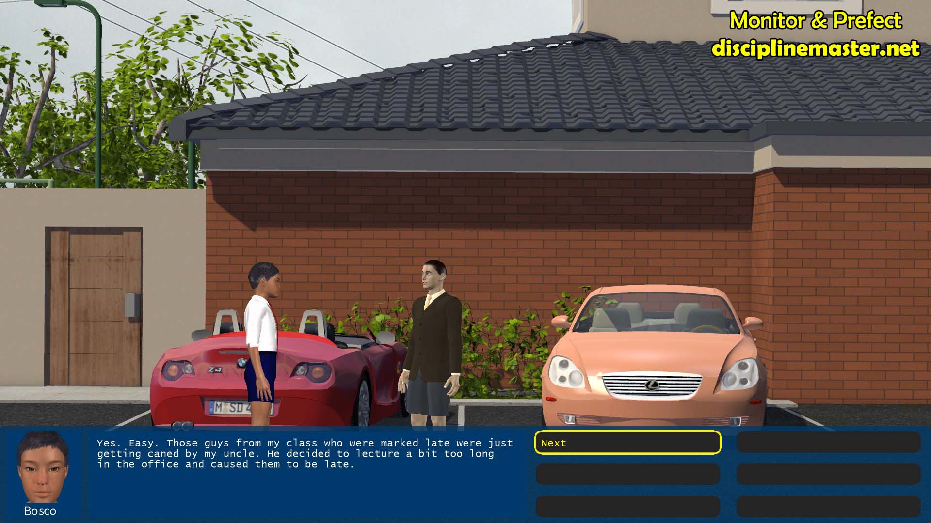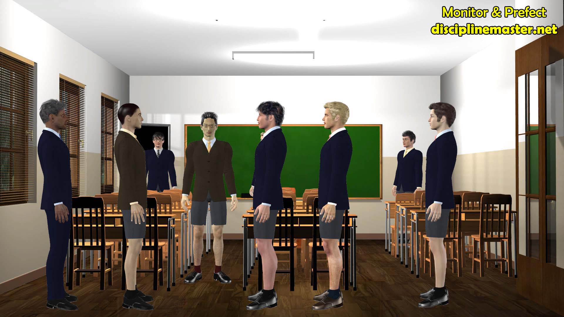 Discipline Master: Monitor & Prefect (“M&P”) is an interactive corporal punishment themed game for Windows and Mac systems. It is inspired by tongue-in-cheek adventure games from the late 80s and early 90s as well as discipline from that era. Set at an international junior college on a fictional Asian island city state, players take control of a school prefect and adventure with him in a number of discipline related scenarios.