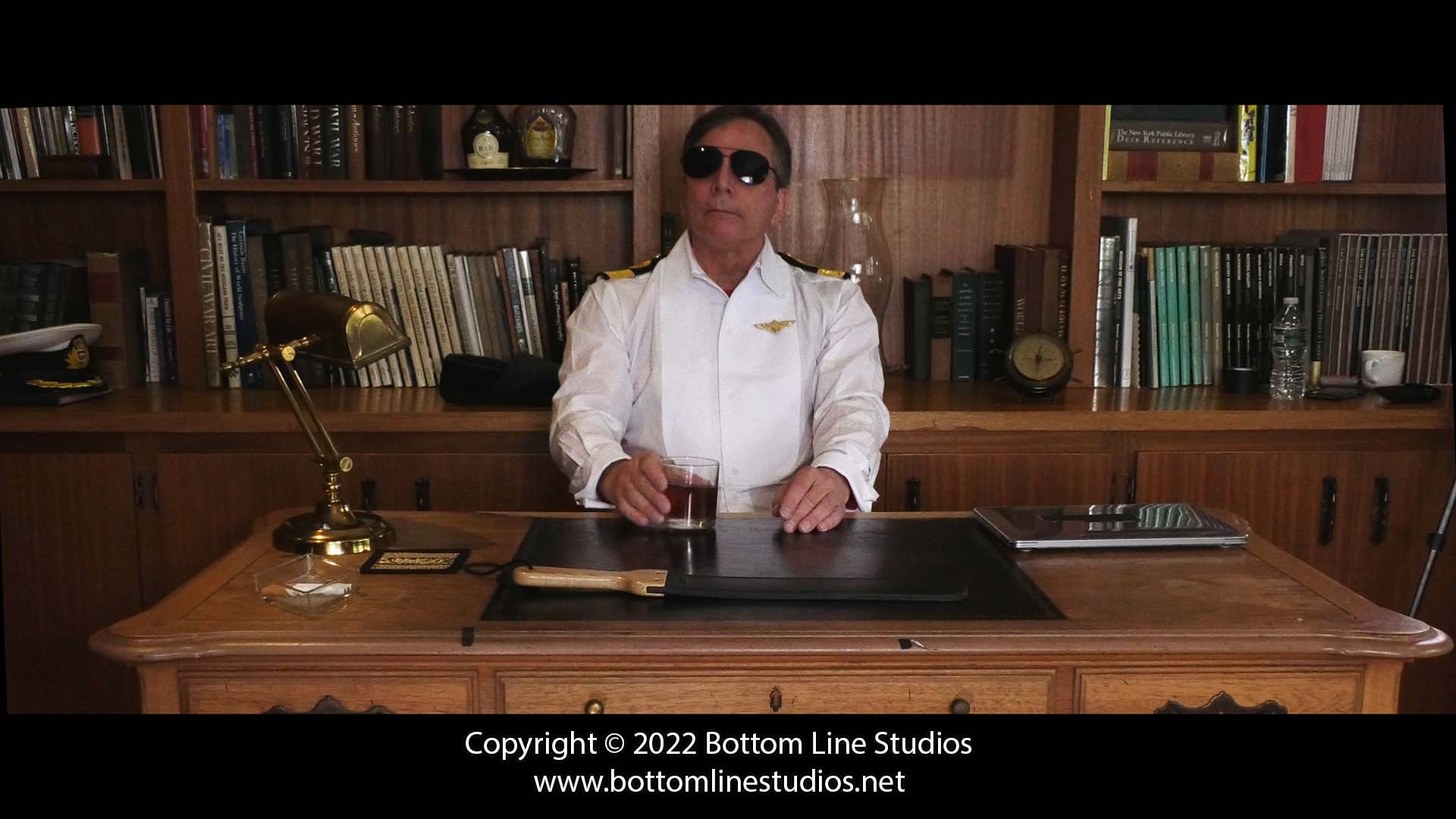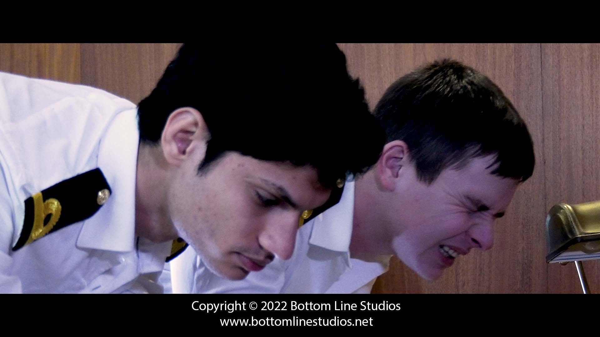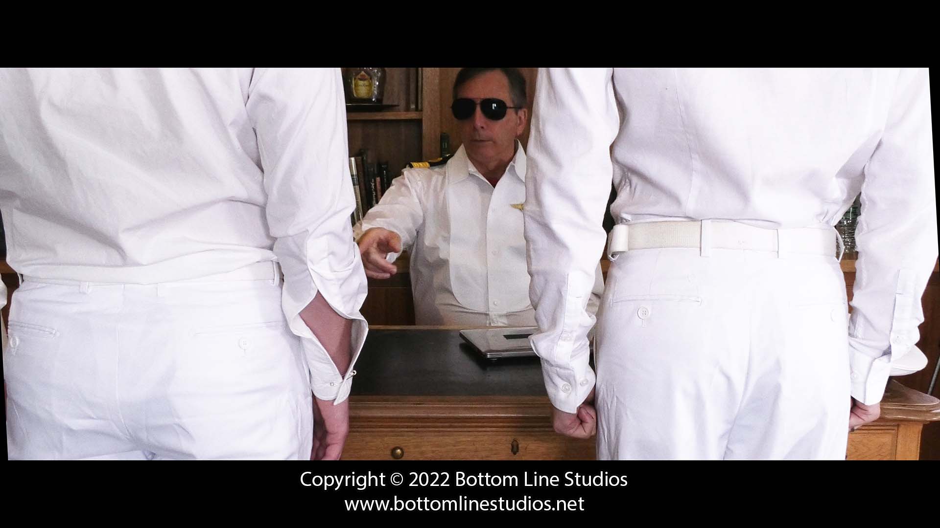 Sub-Lieutenants Alex and Diego stand before Commodore Coburn. After the two errant young officers brawled over a girl on the beach middle of a freezing blizzard (and continue to argue in the office) it is up to the Commodore to restore peace by burning a lesson into their bottoms with the slipper and strap.