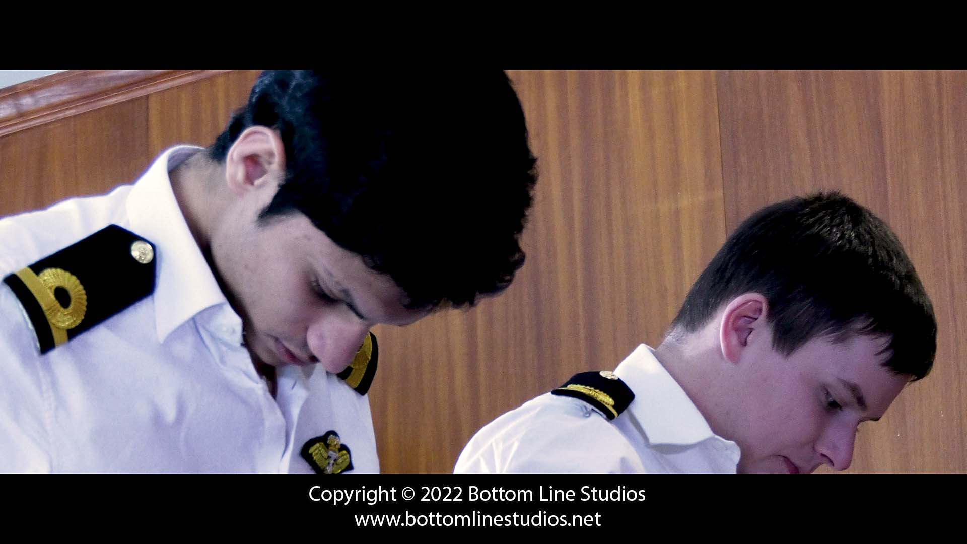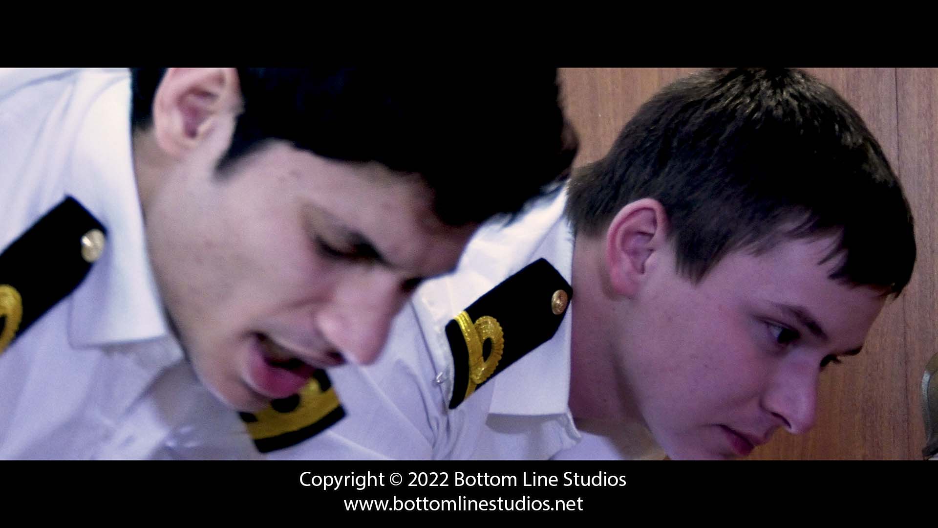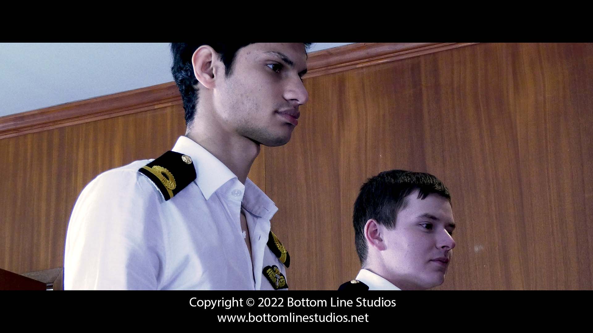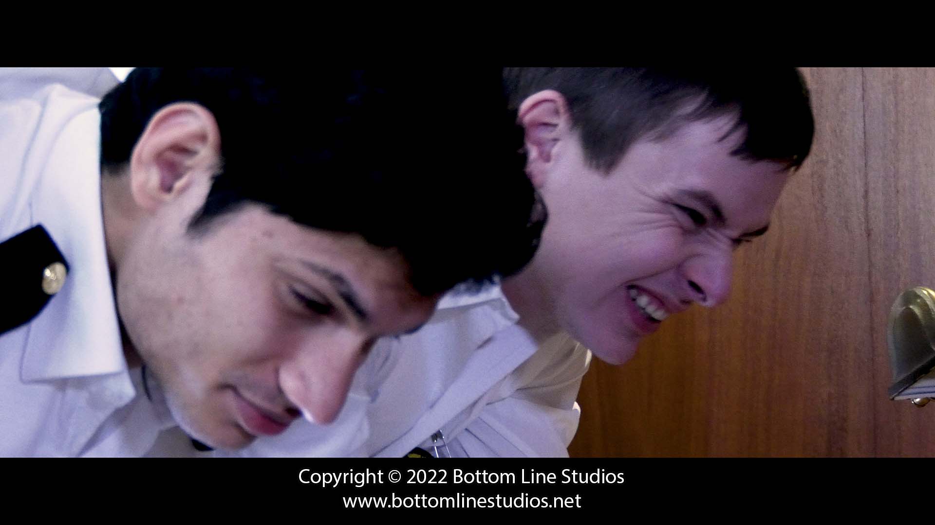 Sub-Lieutenants Alex and Diego stand before Commodore Coburn. After the two errant young officers brawled over a girl on the beach middle of a freezing blizzard (and continue to argue in the office) it is up to the Commodore to restore peace by burning a lesson into their bottoms with the slipper and strap.