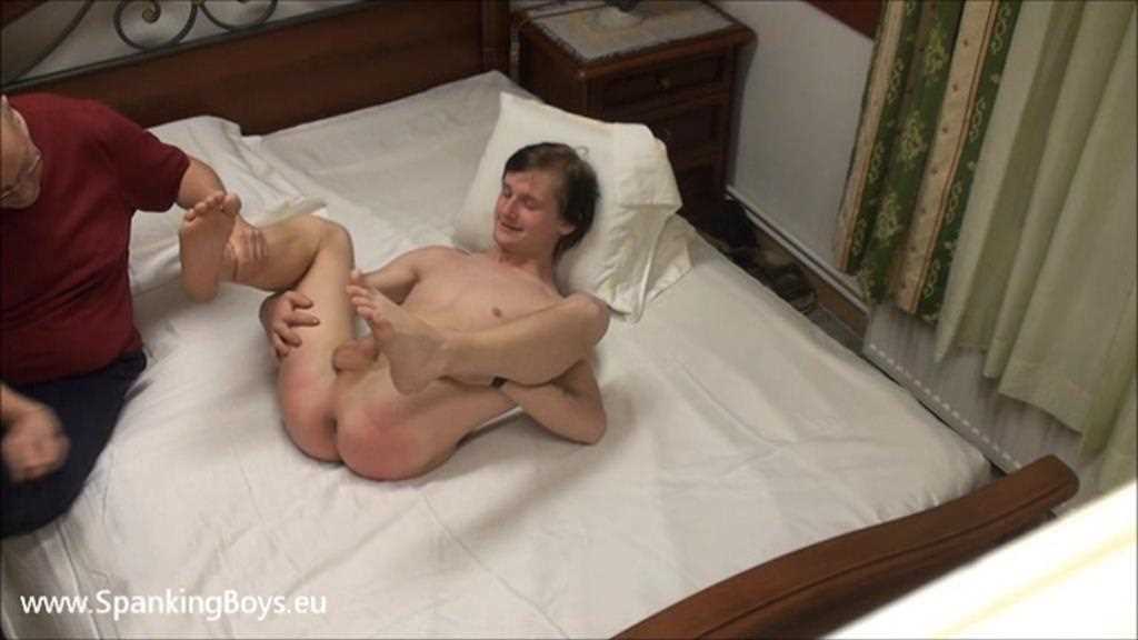 Jason’s punishment also involves him having to weather volleys of strappings all while lying naked on the bed