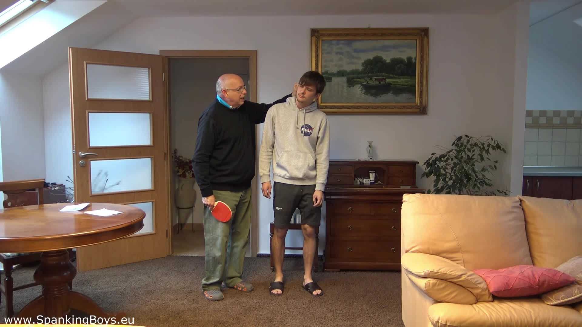 Once completely naked, Noah is again bent over his Guardian’s knee and harshly spanked with the boy’s ping pong paddle, just before receiving another severe hand spanking. Then a round of vigorous slipper paddling follows, alternated to hard hand spanking, while Noah is in the wheelbarrow position and the Guardian holds him by the balls.