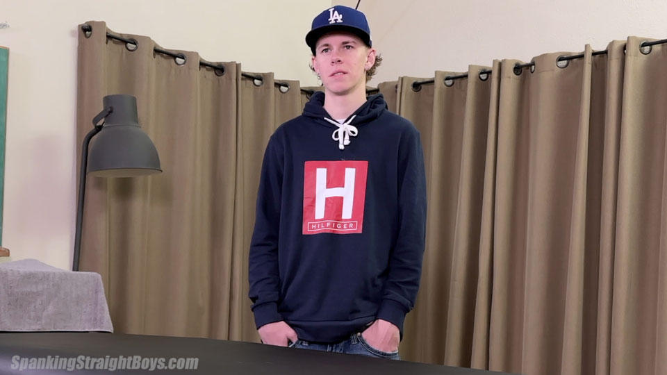 Terry is a blond 20-year-old straight boy. Before today, he had never done any type of adult work. This video begins with a brief interview. Terry’s no stranger to physical discipline, but it has been a while since his last spanking.