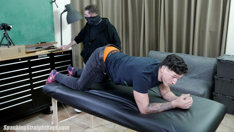 This spanking includes some really good angles, including one that shows Colby’s powerful legs stress and flex as the spanking continues. You can also see his colorful socks and, once those are removed, his feet.