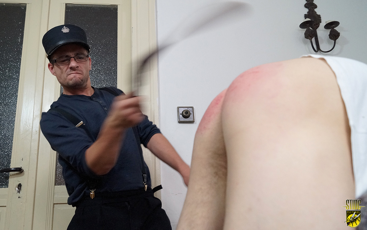 Then Butler is told to position himself over the strapping fame and the flogging begins. His pale vulnerable bare bottom quickly begins to turn red as the old leather strap sears down on to its defenceless target. Butler is a tough young man and takes his punishment well but his very sore backside will keep the memory of discipline laid on for some time to come.